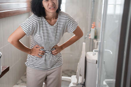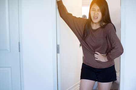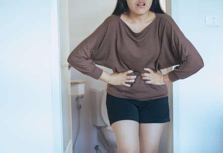 woman with diarrhea symptom; sick woman suffering from diarrhea, stomachache, menstrual period cramp, abdominal pain, food poisoning, gastritis, constipation; asian young adult woman health care model