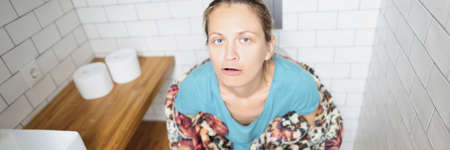 Constipated woman sitting on the toilet, colon health and bowel diseases concept