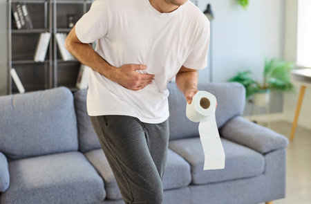 Sick man with diarrhea holding toilet paper roll and abdomen in pain, rushing to restroom at home. Person suffering from cramps and stomachache, nausea and bowel discomfort due to food poisoning