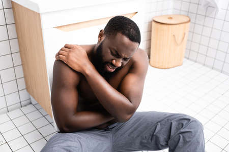 afro-american man sitting on bathroom floor and suffering from back pain