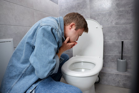 Young man suffering from nausea over toilet bowl in bathroom