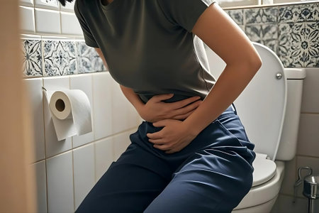 Woman experiencing stomach pain in bathroom near toilet, holding abdomen with discomfort and concern, highlighting health issues and digestive problems.