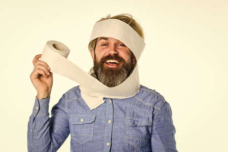 Essential goods. Consumerism. Man hold toilet paper. Hipster with tissue. limit usage. Online shop. Guy having fun with toilet paper. Softness strength and absorbency. Prevent Toilet Paper Hoarding