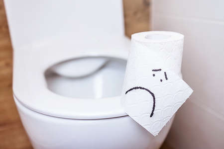 Man holding toilet paper and using toilet with suffering from Diarrhea and Hemorrhoids after wake up in morning at home