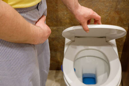 the man in the pajamas standing above the toilet and holding his abdomen. Concept of problems with prostate and urination