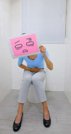 vertical of asian woman hold cartoon billboard painful facial expression about intestine and blood stool in wc