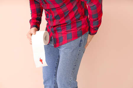 Young man holding toilet paper with blood spot on color background. Hemorrhoids concept