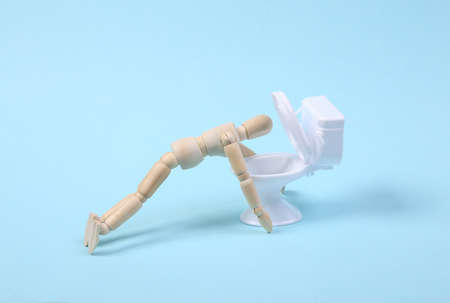 Poisoning. feeling unwell Wooden puppet with toilet bowl on blue background
