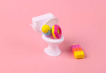 Toilet with donut and ice cream on pink background