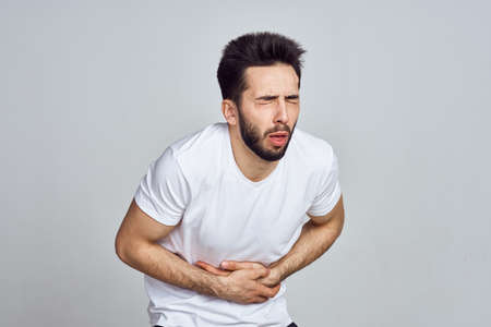 The guy is holding his hands to his stomach. The concept disorders of the stomach, severe pain, indigestion, bloating.