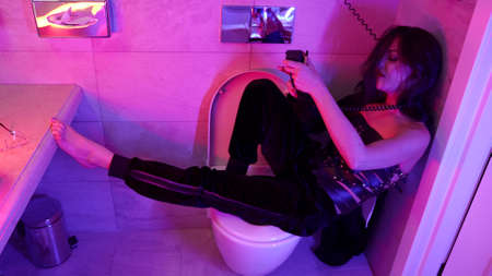 drunk prostitute is wrapping telephone cord around her neck in toilet of hotel or nightclub