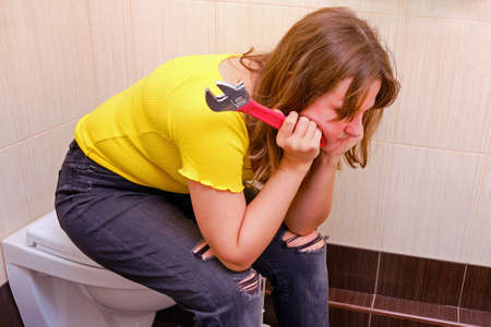 Plumbing problems in the bathroom. A woman sits and thinks on the toilet with a wrench in her hand