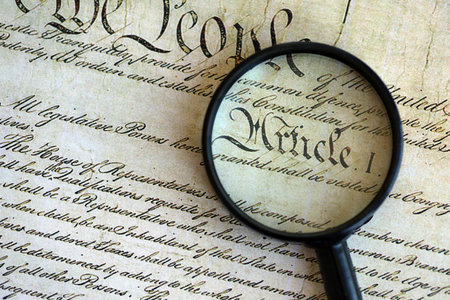 Magnifying glass and United States Constitution. American USA Constitution paper page and loupe close up