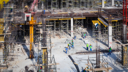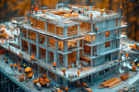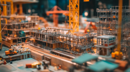 Tilt shift architectural photography of a sunset construction site with workers and heavy machinery