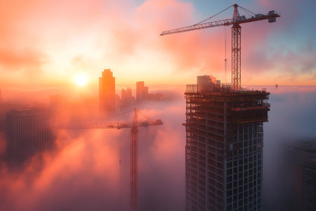 Aerial perspective of a crane over a city construction site amidst sunset and morning fog