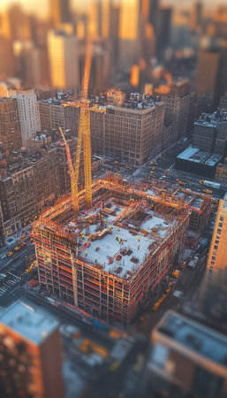 Aerial tilt shift view of a bustling construction site during golden hour with active workers