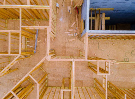 Wooden house in American beams the view of building frame structure on a new development framing of under construction