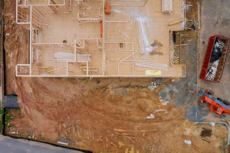 Aerial view of apartment framing of a new house under construction with forklift stacker wooden boards the construction trash dumpsters
