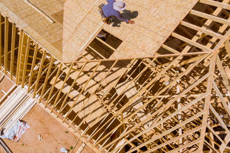 Carpenter applying plywood to roof of addition on home roofing construction in wooden roof frame