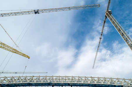 tower cranes against the blue sky. House under construction. Industrial skyline