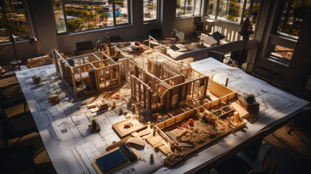 Miniature construction endeavor: skilled workers meticulously craft an architectural model, referencing plans and blueprint documents.