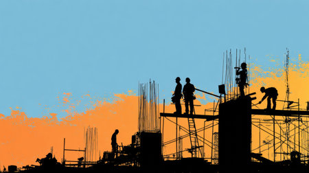 Construction workers collaborated on a site at sunset, demonstrating teamwork and effort in the building industry on Labor Day.