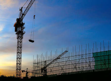 the construction of a multistory building at sunset against the sunlight of the building and workers in silhouette.