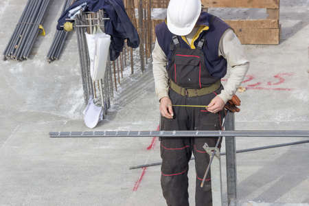Dnepropetrovsk, Ukraine - 02.10.2022: A worker prepares formwork for a modern metal-concrete structure of a residential building.