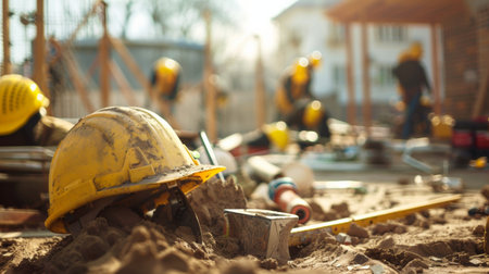 Construction site with hard hat and safety equipment. Selective focus.
