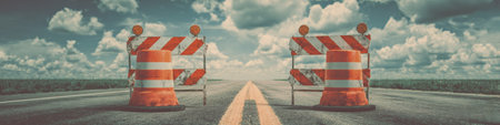 Broken arrow sign and road barriers create an obstacle on the highway under a cloudy sky, symbolizing challenges in life and business.