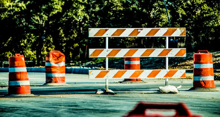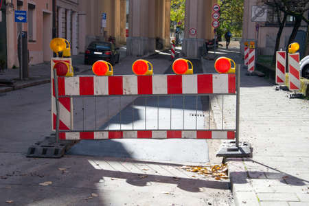 Road barriers, traffic regulation. Construction site, factory territory. Security
