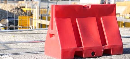 Close up of the top of a red and white construction site barrier with focus in the foreground