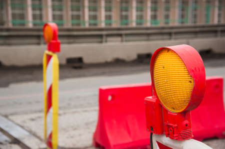 Close up of yellow warning orange construction light on barricade intended to warn construction site.