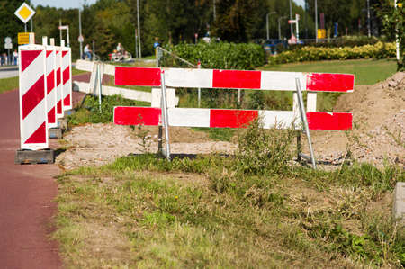 In connection with the road works, the road is closed with reinforced concrete slabs painted in a warning pattern with diagonal red and white stripes, behind them rubble for the road surface is piled