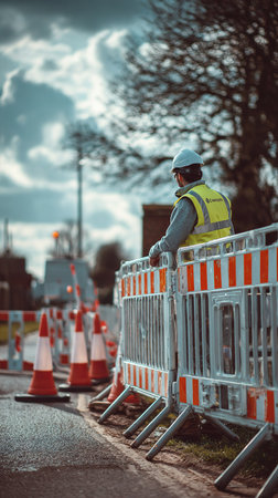 A vivid image showcasing a traffic signal barrier with blinking orange lights in a damp urban environment, emphasizing road work safety for vehicles and pedestrians.