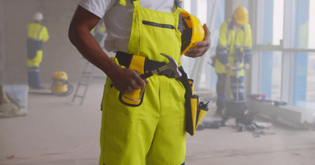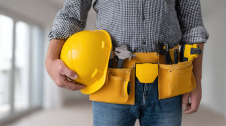 A construction worker stands confidently in a bright indoor space, holding a yellow hard hat and wearing a tool belt filled with essential tools for renovation tasks.