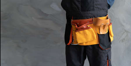 Close-up of a construction belt at the waist of a craftsman standing against a gray concrete wall indoors. Renovation and building supplies concept. A man with a belt on his robe.