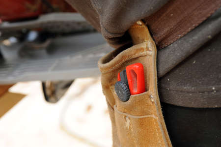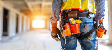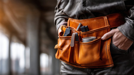 Closeup on tools in belt, construction details, handyman ready, onsite work atmosphere