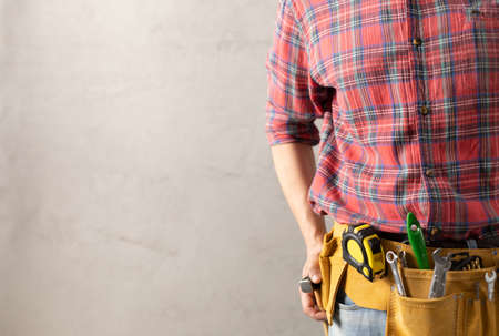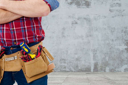 Worker man with tool belt near concrete or cement wall. Male hand and tools for house room renovation. Home renovation concept
