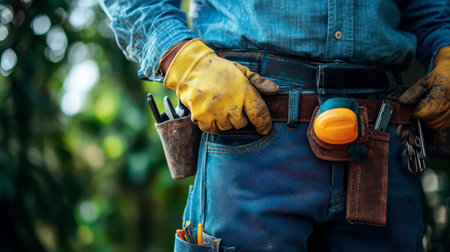 A skilled worker stands in a green environment, wearing a denim shirt and gloves, with a well-equipped tool belt, ready to tackle the days tasks in nature.