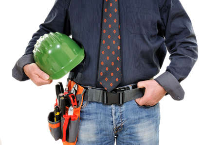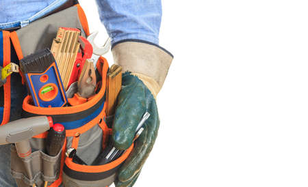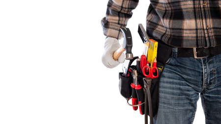 Cropped image of technician with tool belt around waist holding pliers over white background