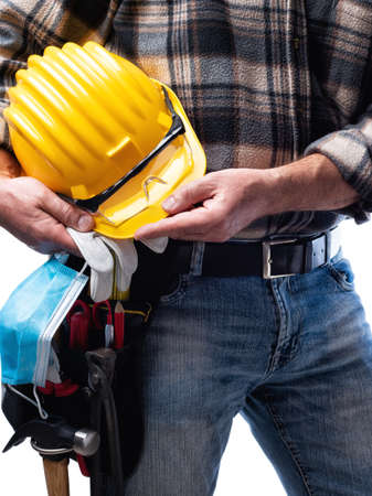 Carpenter isolated on white background, holds helmet, goggles, leather gloves and surgical mask in hand to prevent Coronavirus infection. Construction industry work tools. Covid-19 Pandemic Prevention.