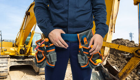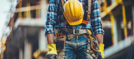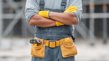 A confident male construction worker stands at a job site, wearing safety gloves and a tool belt, showcasing readiness for work in the construction industry.