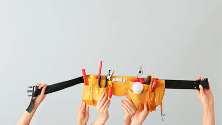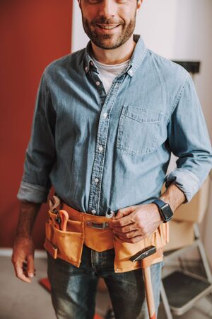 Man worker and tool belt near wall. Male hand and construction tools. Renovation or repair concept