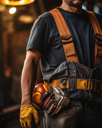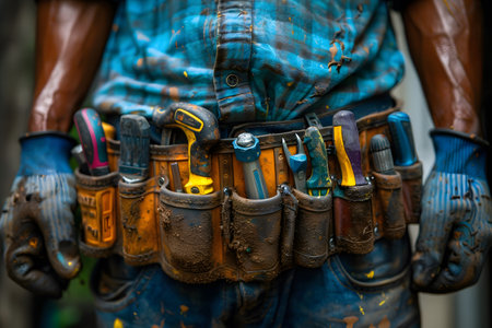 A close-up view of a construction worker's tool belt filled with various tools, including a drill, screwdrivers, and wrenches. the worker wears gloves and a plaid shirt, suggesting hands-on, practical work in home improvement, remodeling, or repair projects. Generative AI