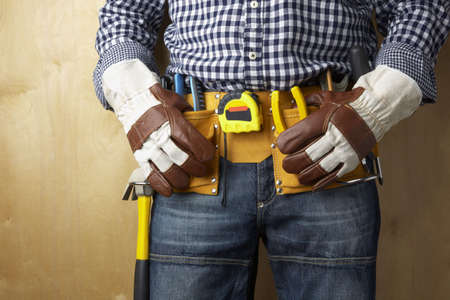 Close up of repairman wearing a tool belt with various tools holding a measure tape while getting ready for working