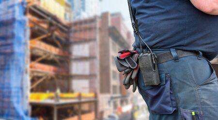 Construction worker. Cropped photo of male professional builder in working uniform with construction tools holding a safety red helmet while standing outdoor of construction site