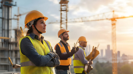Group of construction workers wearing helmets and vests holding tools. for labor and building themes.