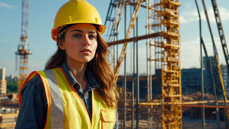 Young female cement worker leads her team at a lively construction site during daylight hours