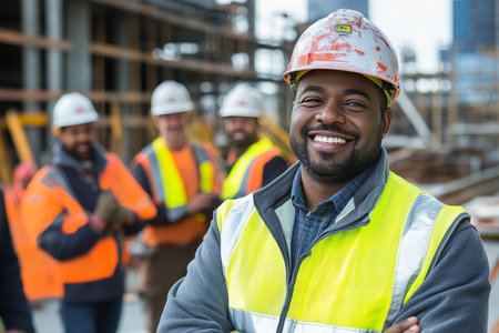 Portrait of smiling engineer in diverse team at construction site highlighting collaboration